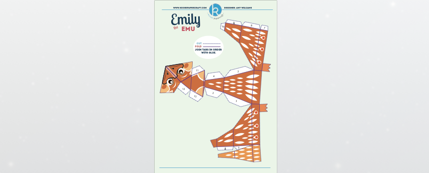 Emily the Emu paper model comes in a downloadable printable pdf as a template that you construct easily with some paper, scissors, a bit of glue and some free time. Each model roughly takes around 10-15 minutes to make. Any printer paper is suitable; for best results use thick paper (preferably 200gsm).